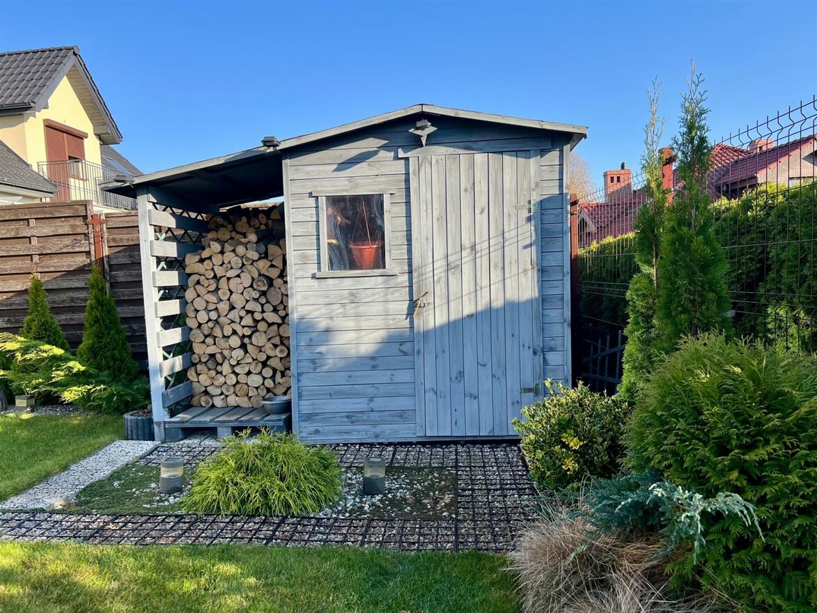 Na działce znajdują się liczne nasadzenia oraz praktyczny domek narzędziowy.